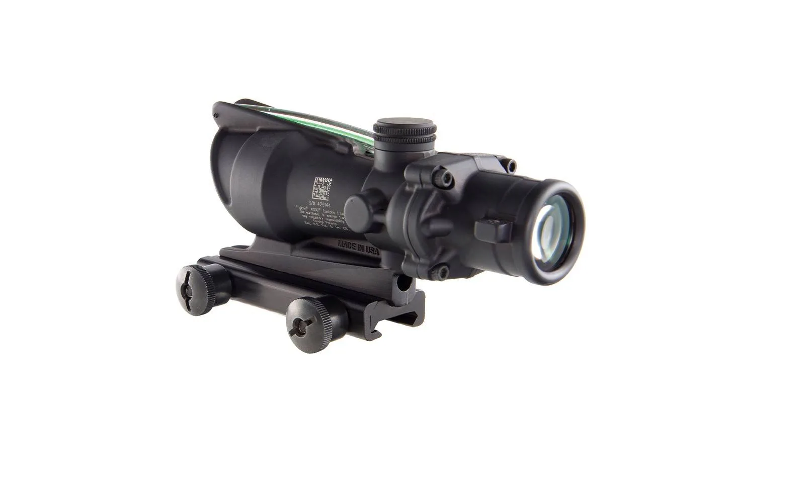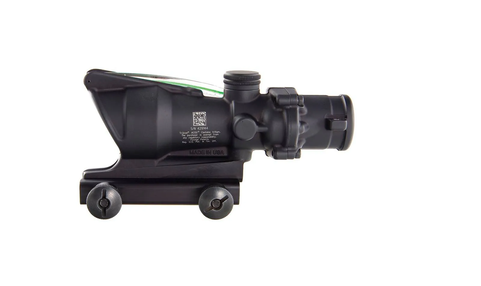 ACOG 4×32 Scope with Green Horseshoe BAC Reticle- includes Flattop Adapter. Features dual illumination (Fiber optics provides daylight illumination and tritium illuminates reticle at night). The ranging reticle is calibrated for 6.8 SPC flattop rifles out to 800 meters.
