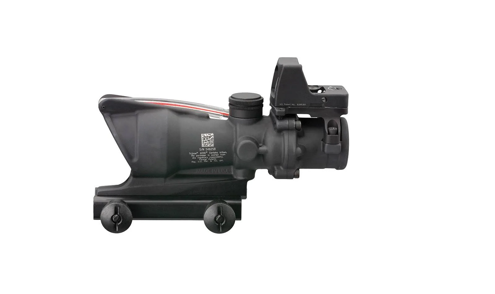 Adapted from the battlefields, US Forces have begun improving this proven Trijicon ACOG scope by adding a small red dot sight on top for close encounter missions. Trijicon has now created a similar model for the public, the TA31-D-100549. The main Trijicon scope provides a dual-illuminated reticle using fiber optics and tritium for bright aiming point in any light condition. The ranging reticle allows for bullet drop compensation out to 800 meters without any manual adjustments. A Trijicon RMR Type 2 sits on top with a 3.25 MOA aiming dot.